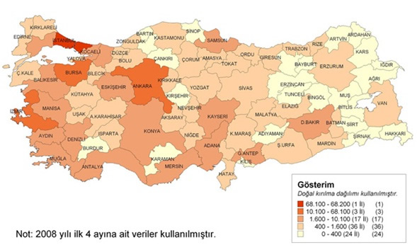 2008 Yılı İlk 4 Ayına Ait Trafik Kaza Sayısının İllere Göre Dağılımı